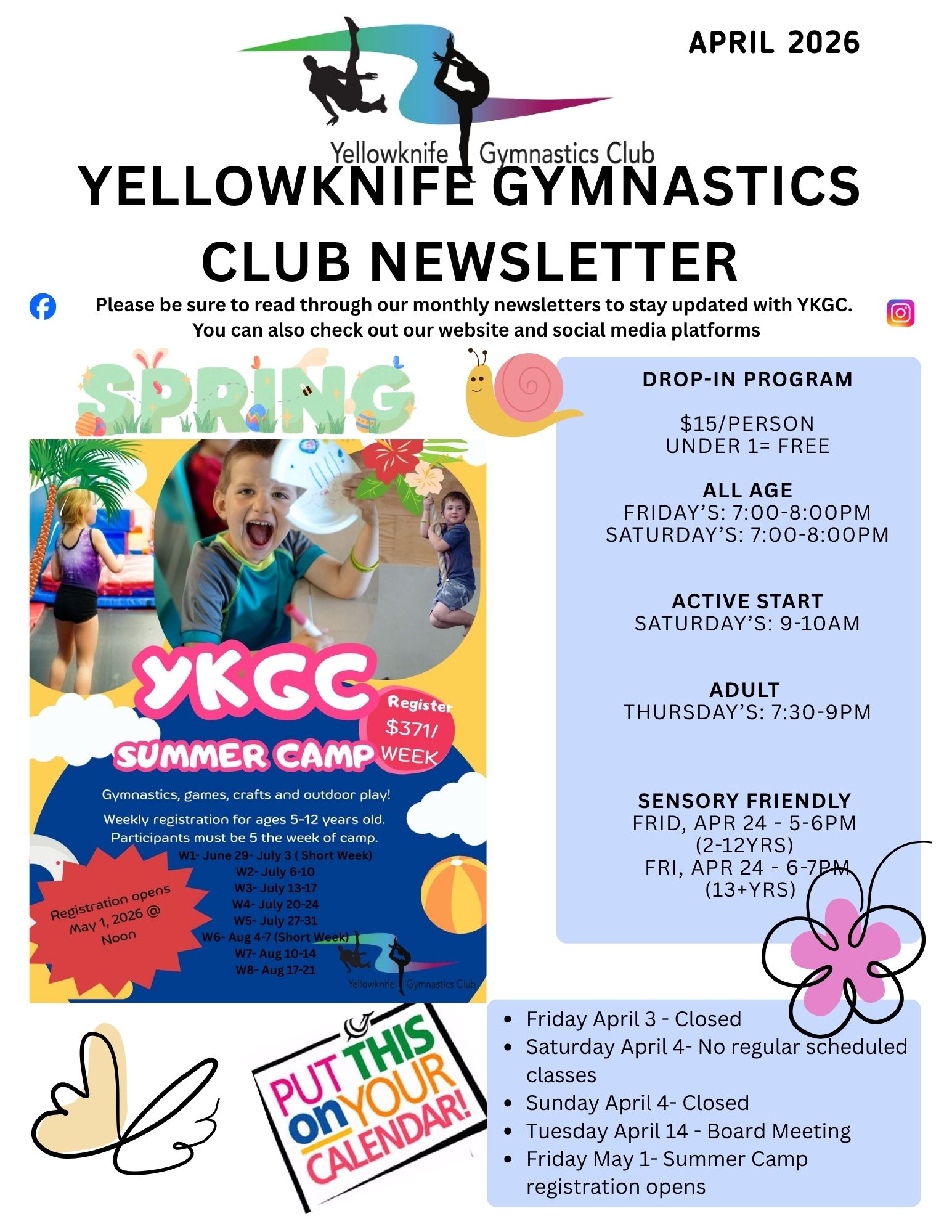 Yellowknife Gymnastics Club Elaine Keenan Bengts Gymnastics Centre News APRIL NEWSLETTER posted Apr 1, 2026, 9:00 AM